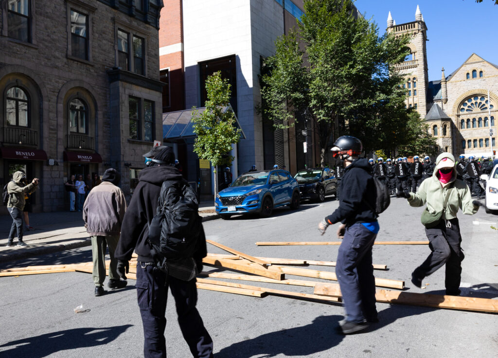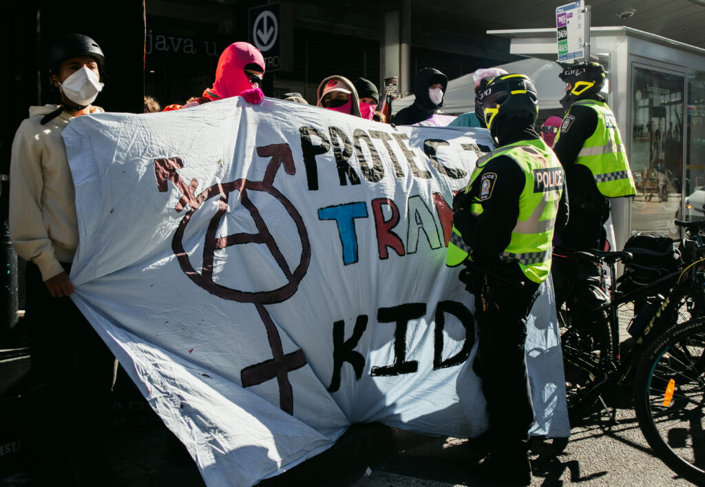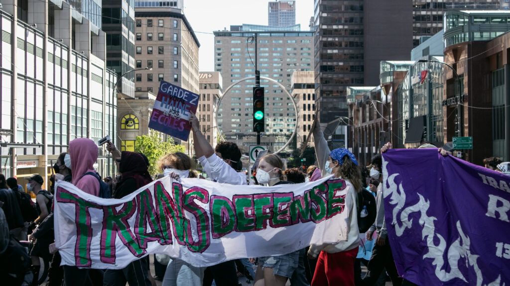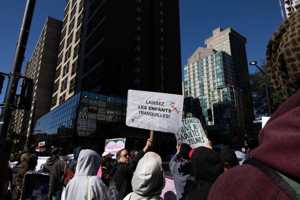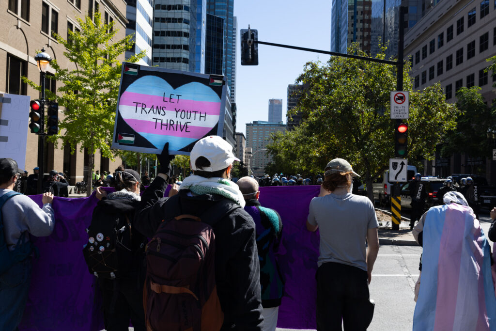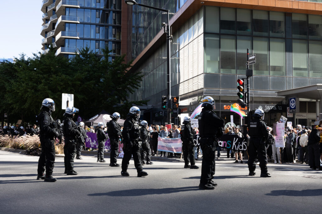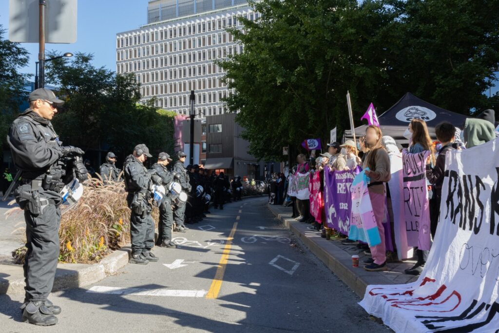On Sept. 20, approximately 250 counter-protestors gather around 10:00 a.m. in preparation for the arrival of Ensemble Pour Protéger Nos Enfants (EPPNE) members. EPPNE held a demonstration an hour later to oppose the inclusion of 2SLGBTQIA+ identities in sexual education in primary or secondary school.While counter-protestors chant across the slowly growing group of EPPNE demonstrators on de Maisonneuve Blvd., at least 40 police officers in riot gear position themselves on the street, facing the counter-protestors. The police are armed with short and long-range tear gas launchers, which were deployed one month ago against Rad Pride marchers, inadvertently injuring a 10-month-old when tear gas was launched into a crowd of bystanders.Around 30 members of EPNNE gather in Norman Bethune Square for their third annual demonstration. While the organization claims not to defend homophobic or transphobic ideas, they maintain that gender affirming responses in schools are experimental treatment or abuse.The EPPNE emphasizes the rights of parents to regulate and control their children’s education. On the testimonial section of EPPNE’s website, parents lament their alienation from children brainwashed by gender ideology, not acknowledging that the alienation may come from their own lack of acceptance.Transgender Day of Remembrance, coming up on Nov. 20, honours the memory of those lost to anti-transgender violence around the world and calls for action to protect transgender people. The counter-protest was held in honour of Sam Nordquist, a transgender man who was kidnapped, tortured, and killed earlier this year after local authorities neglected to undertake due diligence on several occasions.Jean-François Roberge, Quebec’s French-language Minister, is set to present legislation banning the use of gender-neutral language in official messages. Although Roberge says the move aims to simplify and clarify communication, its material effect regresses the French language and alienates individuals identifying outside of the gender binary.One counter-protestor converts EPNNE’s phrase “Leave the kids be!” to “Leave the trans kids be!” EPNNE’s messaging in favour of banning trans identities at school encourages violence and bullying towards transgender youth and hinders their self-acceptance.A group of counter-protestors place planks of wood on Crescent St. between themselves and the advances of riot police holding shields. The group of counter-protestors was forced to retreat to de Maisonneuve Blvd. when officers charged towards them while hitting their batons against their shields.Around noon, officers used pepper spray to push back a group of protestors trying to advance up Crescent St. towards Sherbrooke St. The brutal tactic is common practice for the SPVM, who attempted to break up last year’s counter-protest against transphobia in the same manner.From Alberta to the United States, anti-trans legislation is appearing throughout North America, targeting educational settings, healthcare providers, and parental and civil rights. Organizations like the Transgender Legal Defense & Education Fund and Egale gather policy experts, lawyers, educators, and organizers to work towards protecting and defending transgender people at all levels of government.Counter-protestors gather in front of the Roddick gates across from a small group of remaining EPNNE demonstrators around noon, marking the end of the march. Among the chants from counter-protesters, they use, “Queer power,” ”Trans rights are human rights,” and “We’re here. We’re queer. You can’t make us disappear.”A counter-protester holds a transgender pride flag with the message, “Trans rights are human rights,” inside McGill metro station following the end of the demonstration and counter-protest. In an interview with The Tribune, Celeste Trianon, a front-line advocate for the counter-protest and founder of a legal clinic that supports trans individuals, said, “Schools are already unsafe for trans kids… will [schools] actually protect children, or will [schools] put them in further danger?”