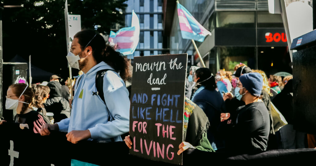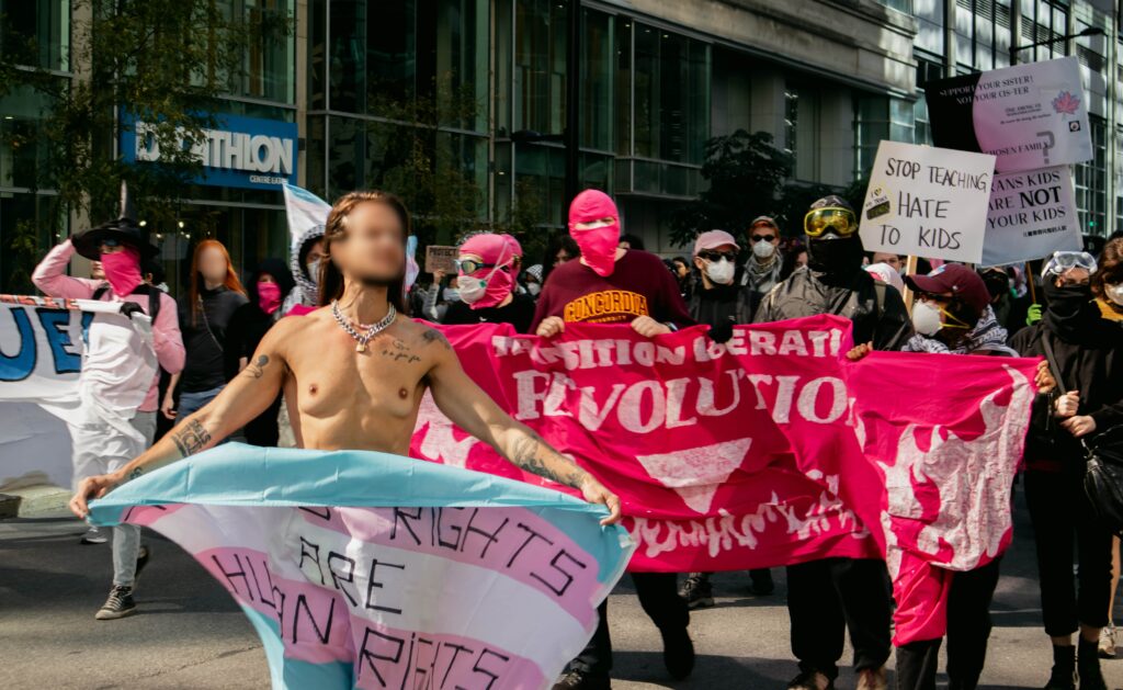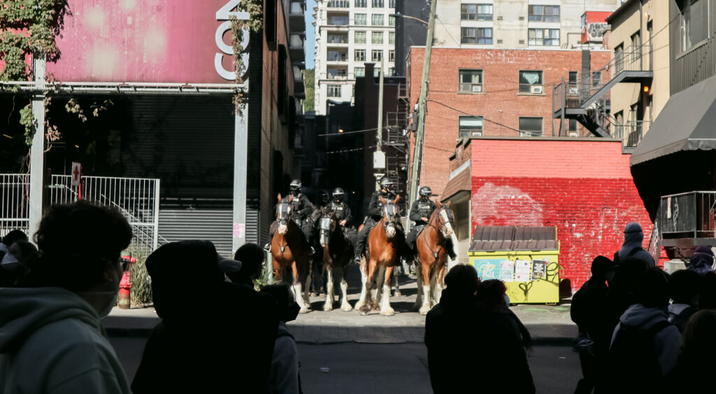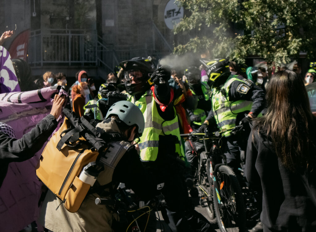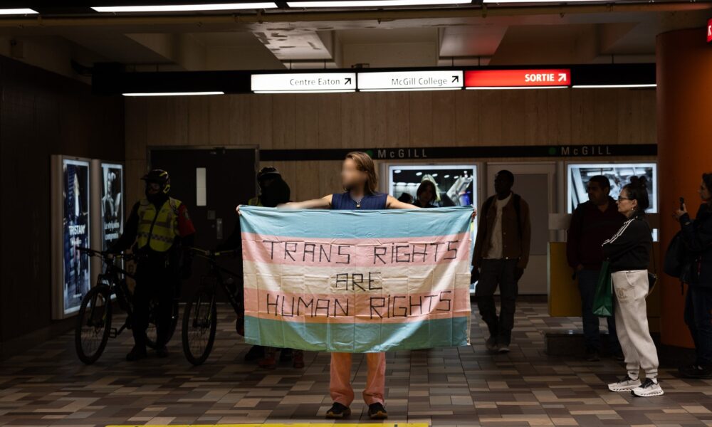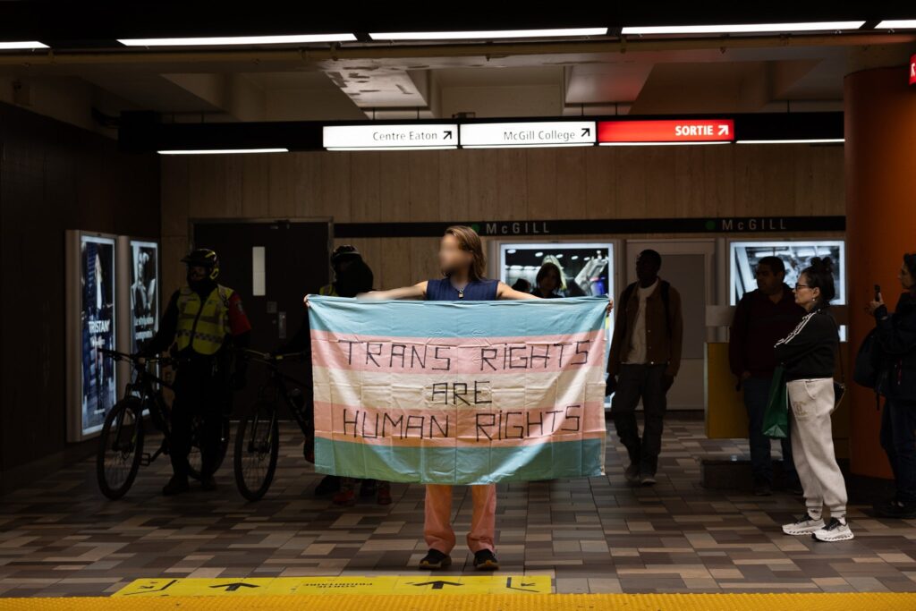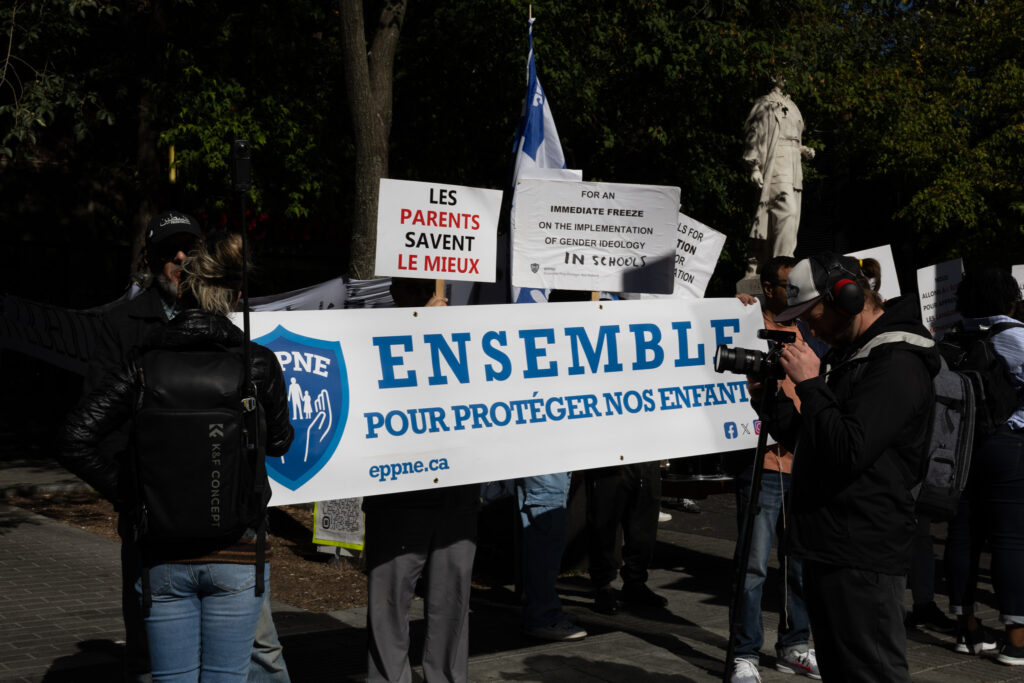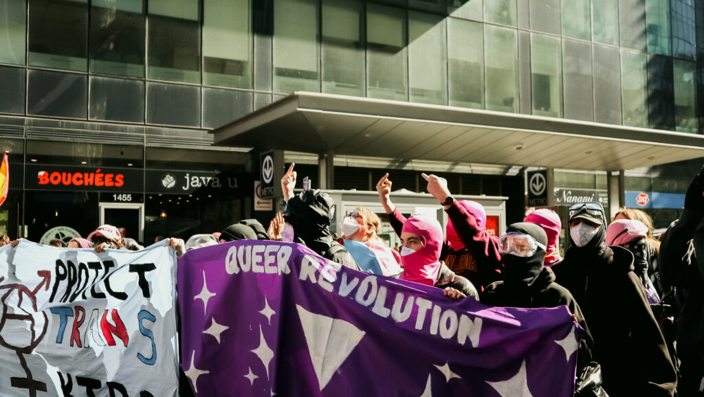On Sept. 20, approximately 250 counter-protestors gather around 10:00 a.m. in preparation for the arrival of Ensemble Pour Protéger Nos Enfants (EPPNE) members. EPPNE held a demonstration an hour later to oppose the inclusion of 2SLGBTQIA+ identities in sexual education in primary or secondary school.While counter-protestors chant across the slowly growing group of EPPNE demonstrators on de Maisonneuve Blvd., at least 40 police officers in riot gear position themselves on the street, facing the counter-protestors. The police are armed with short and long-range tear gas launchers, which were deployed one month ago against Rad Pride marchers, inadvertently injuring a 10-month-old when tear gas was launched into a crowd of bystanders.Around 30 members of EPNNE gather in Norman Bethune Square for their third annual demonstration. While the organization claims not to defend homophobic or transphobic ideas, they maintain that gender affirming responses in schools are experimental treatment or abuse.The EPPNE emphasizes the rights of parents to regulate and control their children’s education. On the testimonial section of EPPNE’s website, parents lament their alienation from children brainwashed by gender ideology, not acknowledging that the alienation may come from their own lack of acceptance.Transgender Day of Remembrance, coming up on Nov. 20, honours the memory of those lost to anti-transgender violence around the world and calls for action to protect transgender people. The counter-protest was held in honour of Sam Nordquist, a transgender man who was kidnapped, tortured, and killed earlier this year after local authorities neglected to undertake due diligence on several occasions.Jean-François Roberge, Quebec’s French-language Minister, is set to present legislation banning the use of gender-neutral language in official messages. Although Roberge says the move aims to simplify and clarify communication, its material effect regresses the French language and alienates individuals identifying outside of the gender binary.One counter-protestor converts EPNNE’s phrase “Leave the kids be!” to “Leave the trans kids be!” EPNNE’s messaging in favour of banning trans identities at school encourages violence and bullying towards transgender youth and hinders their self-acceptance.A group of counter-protestors place planks of wood on Crescent St. between themselves and the advances of riot police holding shields. The group of counter-protestors was forced to retreat to de Maisonneuve Blvd. when officers charged towards them while hitting their batons against their shields.Around noon, officers used pepper spray to push back a group of protestors trying to advance up Crescent St. towards Sherbrooke St. The brutal tactic is common practice for the SPVM, who attempted to break up last year’s counter-protest against transphobia in the same manner.From Alberta to the United States, anti-trans legislation is appearing throughout North America, targeting educational settings, healthcare providers, and parental and civil rights. Organizations like the Transgender Legal Defense & Education Fund and Egale gather policy experts, lawyers, educators, and organizers to work towards protecting and defending transgender people at all levels of government.Counter-protestors gather in front of the Roddick gates across from a small group of remaining EPNNE demonstrators around noon, marking the end of the march. Among the chants from counter-protesters, they use, “Queer power,” ”Trans rights are human rights,” and “We’re here. We’re queer. You can’t make us disappear.”A counter-protester holds a transgender pride flag with the message, “Trans rights are human rights,” inside McGill metro station following the end of the demonstration and counter-protest. In an interview with The Tribune, Celeste Trianon, a front-line advocate for the counter-protest and founder of a legal clinic that supports trans individuals, said, “Schools are already unsafe for trans kids… will [schools] actually protect children, or will [schools] put them in further danger?”