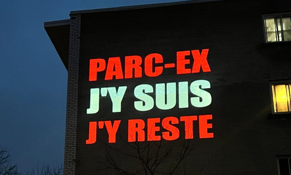 Over 100 tenants and fair housing activists gathered outside 955 av. d’Anvers on March 31 to denounce what organizers called abusive rent increases imposed on residents. Organized by the Regroupement des comités logement et associations de locataires du Québec (RCLALQ) and the Comité d’Action de Parc-Extension (CAPE), the rally’s attendees demanded better rent control. In collaboration with artistic and activist collective Le Sémaphore, the organizers projected messages like “No to abusive rent increase,” and “Je refuse je reste” (“I refuse I’m staying”) onto the building’s exterior.