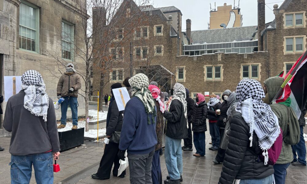At 7:30 a.m., protesters gathered in front of the James Administration Building to demand McGill’s administration divest from companies complicit in Israel’s genocide in Palestine.